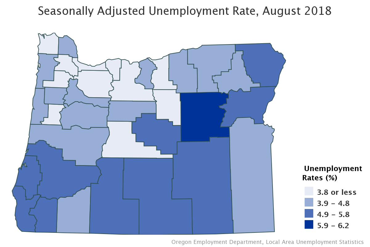 Eleven of Oregon’s counties had unemployment rates below the statewide unemployment rate of 3.8 percent and thirteen were at or below the national rate of 3.9 percent.