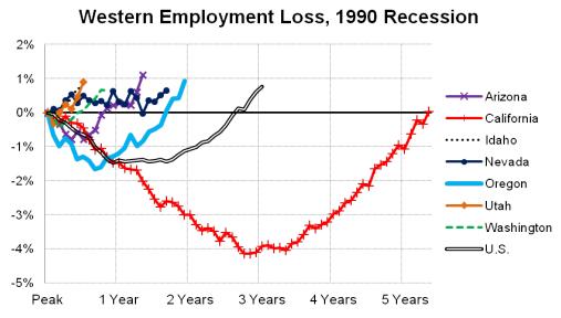 The tech recession or dotcom recession are also common names for the 2001 recession as it was characterized by the buildup of high technology companies, products and stock prices throughout the late 1990s. When the stock market crashed, the resulting economic downturn was again relatively mild from an historical point of view at the national level, however not so on the West Coast. [The middle panel in the graph below] compares employment losses across the Western states during this period.
