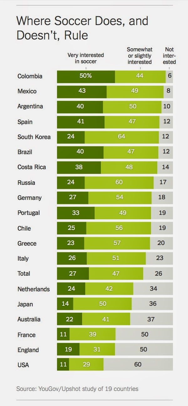 The Upshot, The New York Times‘s answer to FiveThirtyEight edited by David Leonhardt has some fantastic poll data about soccer around the world. Here are the two charts from the article: