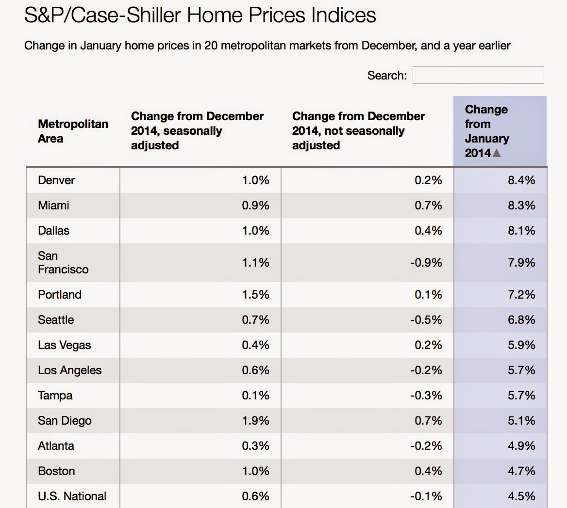 The latest Case-Shiller numbers are out and, after a long hiatus, I thought I’d pour through the numbers. The beat place to start is at the Wall Street Journal‘s Real Time Economics blog where you can find a sortable chart as well as a link to some great interactive graphics.