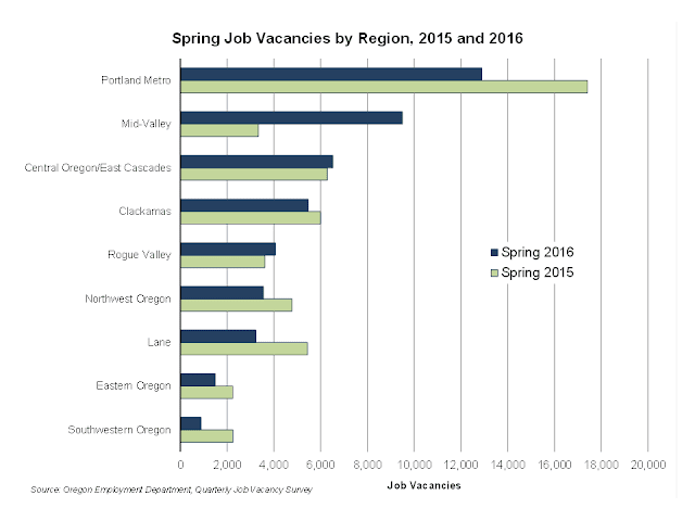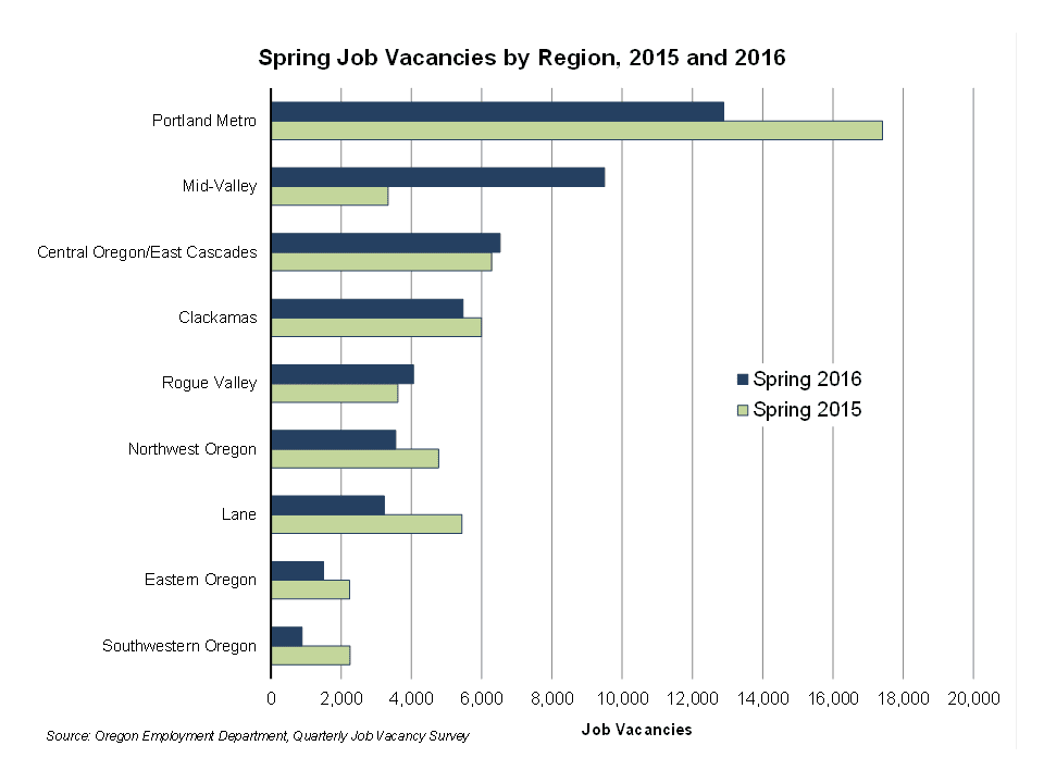 Oregon businesses reported 47,600 vacancies in spring 2016. That’s an increase of 6,400 from winter, but 5,700 fewer job vacancies than the all-time high of 53,300 in spring 2015.