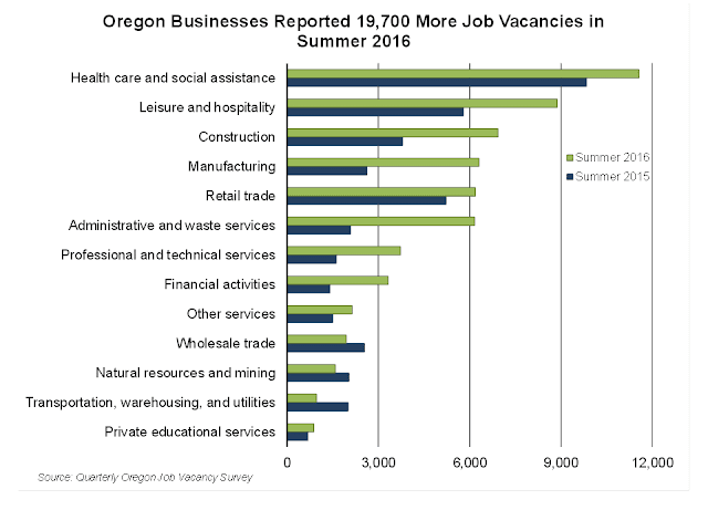 Oregon businesses reported 61,000 job vacancies in summer 2016. That marks an increase of 19,700 job vacancies from the prior summer, and the largest number of job vacancies recorded in the state since the Oregon Job Vacancy Survey began in 2008.