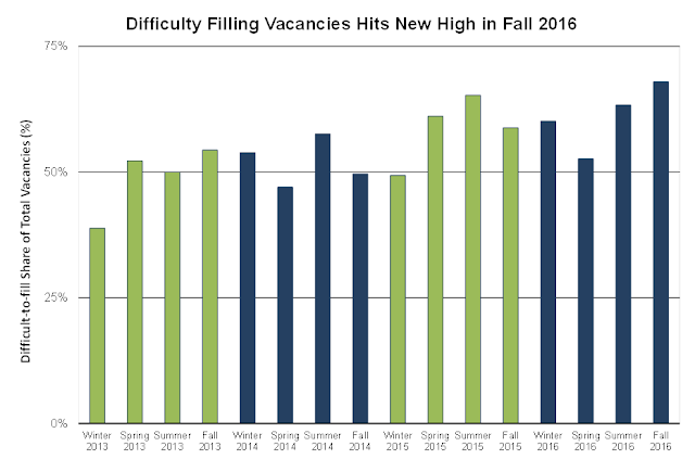 With continued job growth and low unemployment, businesses have also reported more difficulty filling job vacancies In fall 2016, the share of all job openings reported as difficult to fill (68%) hit its highest point in the four-year history of the quarterly job vacancy survey. For more than one-third (37%) of all difficult-to-fill vacancies businesses cited a lack of applicants, compared with 30 percent in fall 2015.
