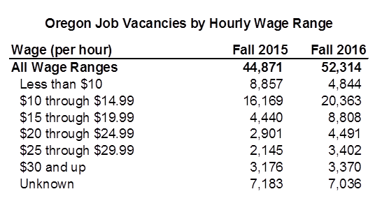 Our latest quarterly job vacancy survey results show Oregon businesses reported 52,300 job vacancies in fall 2016. That’s an increase of 7,400 job vacancies compared with the prior fall.