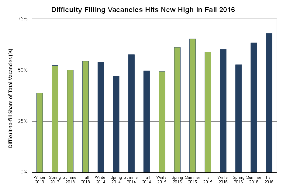 With continued job growth and low unemployment, businesses have also reported more difficulty filling job vacancies In fall 2016, the share of all job openings reported as difficult to fill (68%) hit its highest point in the four-year history of the quarterly job vacancy survey. For more than one-third (37%) of all difficult-to-fill vacancies businesses cited a lack of applicants, compared with 30 percent in fall 2015.