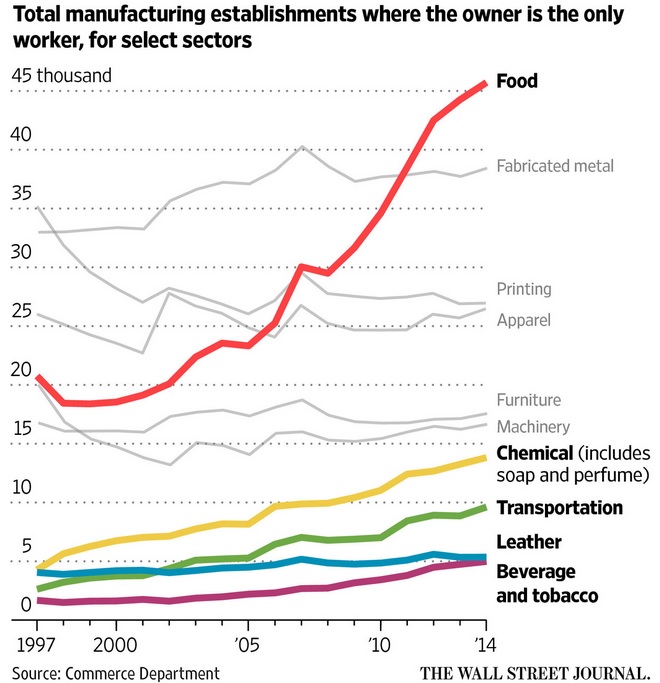 The Wall Street Journal has reported on an unexpected business phenomenon in the manufacturing world. As manufacturing jobs decline nationwide, there is an increase in one person manufacturing jobs run by businesses with only one employee. This is proof that small business is still an important driver in jobs.