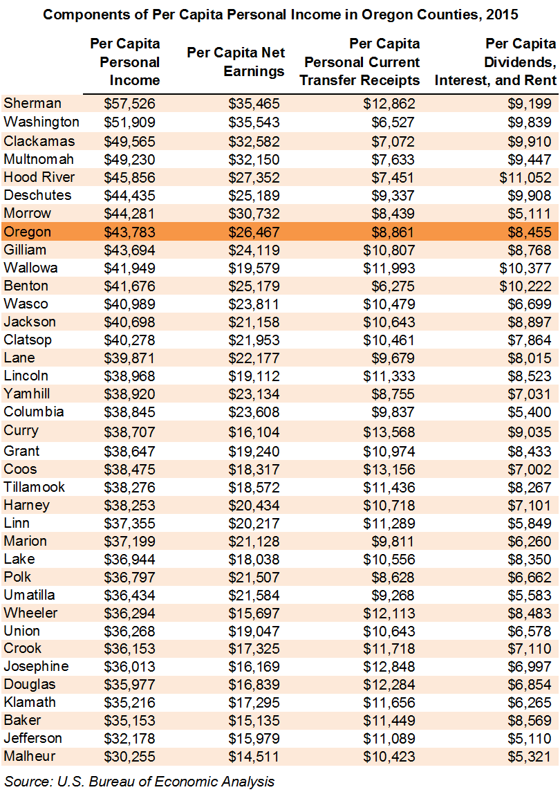 Areas with a higher concentration of older residents can show lower PCPI. In Oregon, Malheur County ($30,255) and Jefferson County ($32,178) had the lowest PCPI. The reason is that as people leave the labor force, they have likely passed their peak earning years, and therefore have less contribution to the net earnings component of personal income. Remember PCPI represents income, rather than wealth. Older residents may have substantial wealth, but not have as much relative income, unless it was income-generating investments that would show up in the “dividends, interest, and rent” portion of PCPI.
