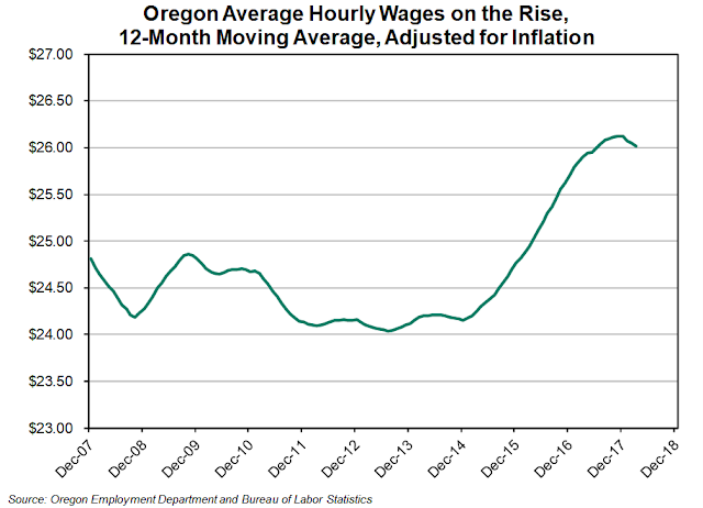 Whatever are the causes of the slowing growth in Oregon’s average hourly wage, we have certainly seen real wage growth slow in Oregon and nationally over the past year.